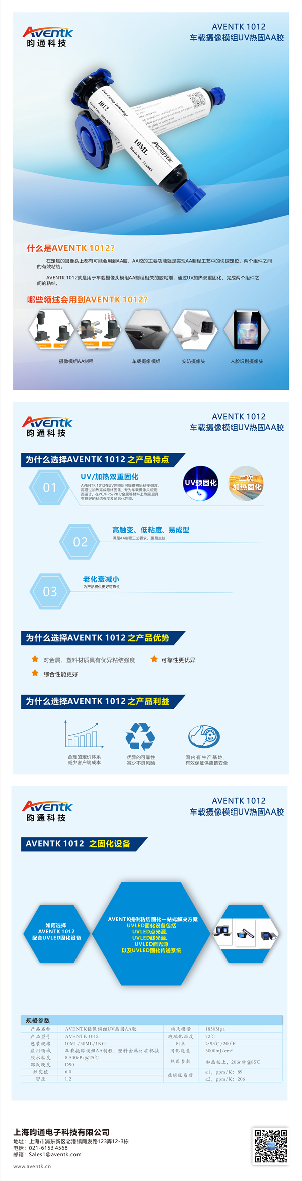 AVENTK 1012系列AA膠水,這是一款通過(guò)UV預固化定位,再通過(guò)加熱完成最終固化的膠水,適用于車(chē)載攝像模組以及安防攝像模組。