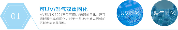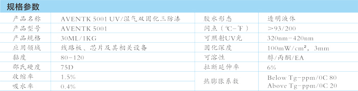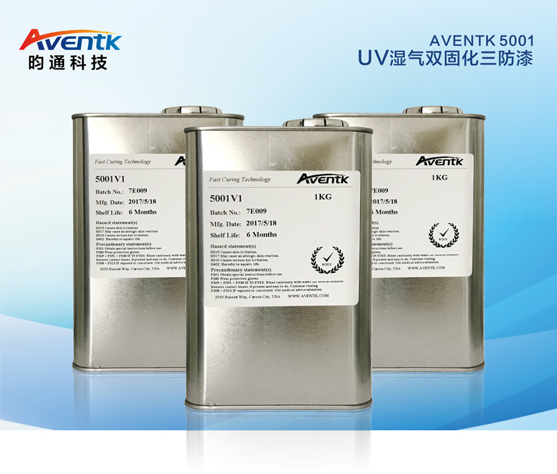 Aventk 5001 是用于電路板保護的、可以UV和濕氣雙重固化的保形涂層,又稱(chēng)三防漆(防潮、防鹽霧、防霉)。