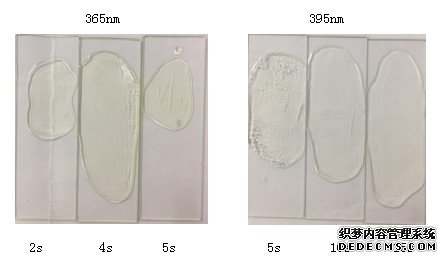 實(shí)驗探討:采用載玻片,膠水4001V1,專(zhuān)業(yè)固化UV LED面光源365nm,395nm,405nm)時(shí)間設定5s.