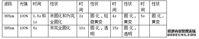 從表二可以看出在395nm波段下,時(shí)間越長(cháng)并沒(méi)有使UV膠層出現黃變現象,而在365nm情況出現了黃變.說(shuō)明能量不是造成黃變的主要原因.即證明了表一得出的第二個(gè)結論是準確的,不同波段才是造成膠層黃變的主要原因.