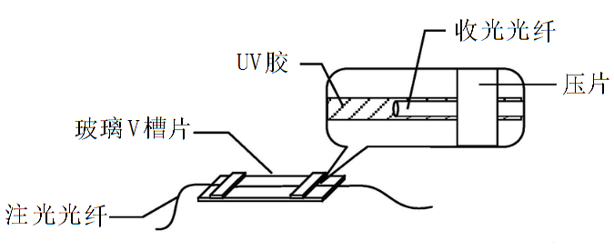 除了上面所講的環(huán)氧灌封膠,其實(shí)在傳感器生產(chǎn)制造中,還有很多其他用膠點(diǎn)會(huì )用到UV膠水。比如將透明UV膠設置在玻璃V槽片上的V型槽內并注滿(mǎn),表面鍍50nm金膜,用于將注光光纖和收光光纖插入。傳感器利用高折射率的透明UV膠注入玻璃V槽片中充當纖芯,在低成本的基礎之上有效的擴大了光纖SPR傳感器可測折射率的范圍,具體結構參見(jiàn)下圖。