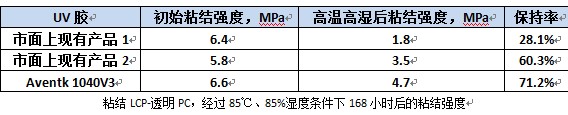 AVENTK 1040V3與市面上現有2款UV膠經(jīng)過(guò)85℃、85%濕度條件下168小時(shí)后的粘結強度對比: