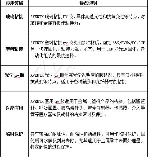 除以上列表內的膠水外,AVENTK目前還主推攝像頭模組uv膠、微信揚聲器uv膠、LCD膠合UV膠等多種uv膠水。