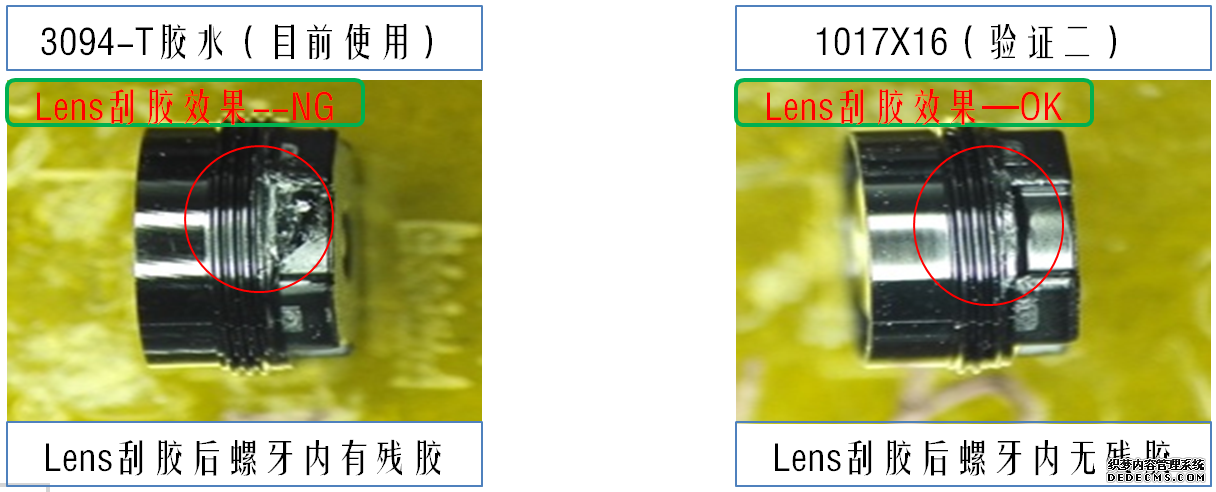 由上圖可以看到,Lens拆解加熱刮膠后,3094效果NG——螺牙內有殘膠;而AVENTK研發(fā)的產(chǎn)品1017X16調焦固定UV膠刮膠時(shí)可以將螺牙內的殘膠一起清除。